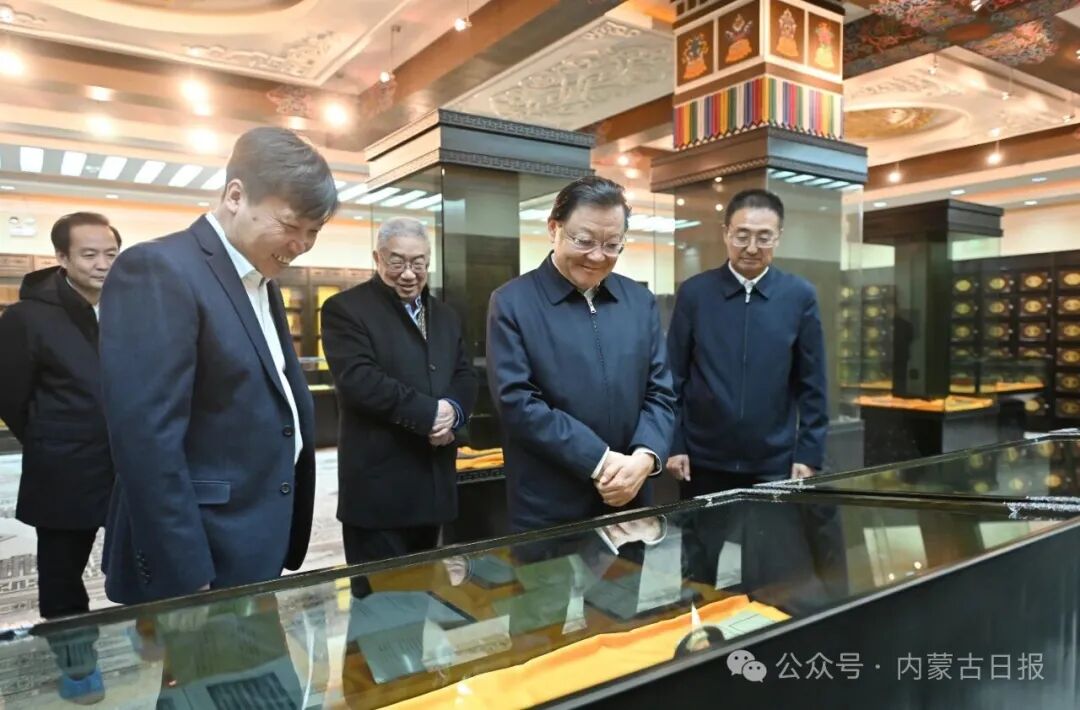12月16日,自治區(qū)黨委書記王偉中來到圖書館、蒙古文古籍文獻(xiàn)展閱室,仔細(xì)察看館藏文獻(xiàn),詳細(xì)詢問圖書文獻(xiàn)資源建設(shè)、研究開發(fā)等工作。草原云·內(nèi)蒙古新聞網(wǎng)記者 馬建兵 攝