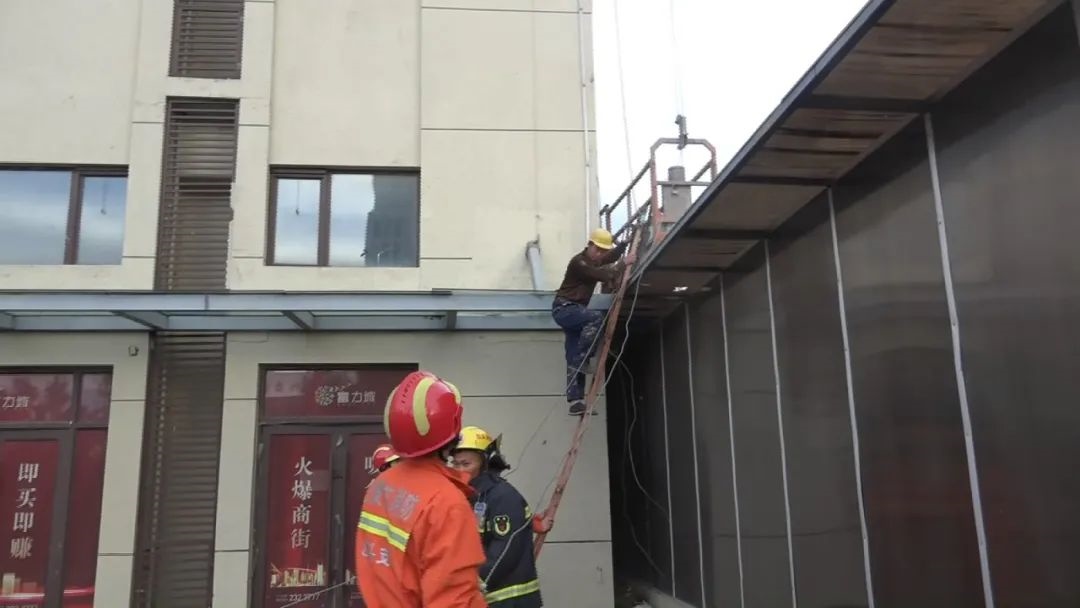 指揮員立即命令第一營救小組前往建筑內(nèi)部,試圖通過住戶窗戶進行營救,當營救小組到達指定位置后發(fā)現(xiàn),消防隊員與被困工人相距太遠,空中營救的危險性和困難程度較高。消防隊員通過與被困工人交流,提醒他抓好繩索,安撫他的情緒。很快,第二組營救的消防隊員利用掛鉤梯爬到二層位置把纏繞的鋼絲繩拉到地面,4人分別拽一根鋼絲繩,松解纏繞的鋼絲繩,使升降機恢復(fù)運行。而此時,天氣逐漸放晴,風力也開始減弱,在消防隊員們的努力下,升降機緩緩下降,18時12分,被困的工人安全降落到地面。