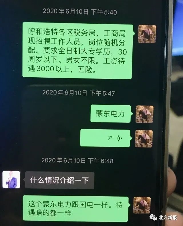“呼和浩特各區(qū)消防大隊招聘辦公室內(nèi)勤人員,工資待遇3500元左右。”“高速交警呼市支隊(一支隊)輔警,工資和五險一金,4200元。”“呼和浩特各區(qū)稅務(wù)局、工商局現(xiàn)招聘工作人員,崗位隨機分配?!薄昂艉秃铺貗D幼保健院招聘護(hù)士,大專學(xué)歷”……記者在民警繳獲的程某某的手機上看到,6月8日以來,程某某和趙某某的聊天記錄中,發(fā)送了多條諸如此類的招聘信息。