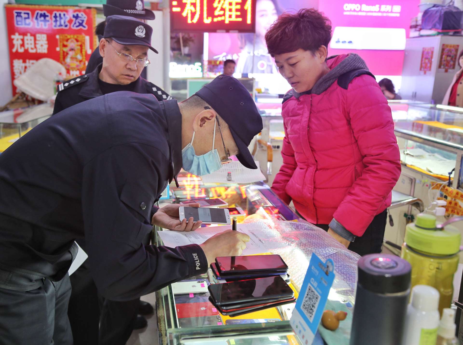 按照預定方案,行動分為四組,兩組對永和二手手機市場和眾興二手手機市場進行突擊清查,另兩組以便衣形式對周圍流動收售手機人員進行排查。行動期間,民警對二手手機銷售店鋪內(nèi)的手機和工作人員情況進行清查,逐一對照登記臺賬,嚴格檢查落實情況,同時向經(jīng)營業(yè)主及市民進行法制宣傳教育。此次行動共排查登記二手手機850部,買賣二手手機人員50余人,檢查二手手機商戶22家,暫扣未履行登記手機30余部。
