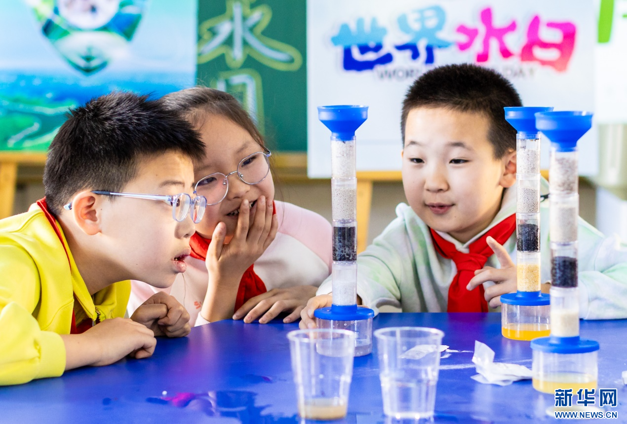 ??3月20日,呼和浩特市玉泉區(qū)石東路小學(xué)學(xué)生在老師指導(dǎo)下,使用簡(jiǎn)易凈水器做凈水實(shí)驗(yàn)。新華網(wǎng)發(fā)(丁根厚 攝)