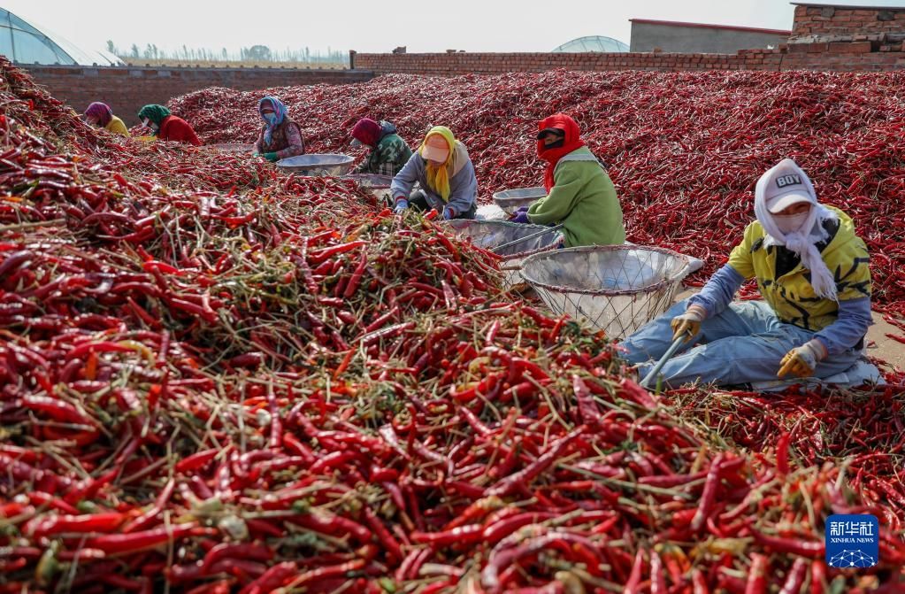 10月25日,在開魯縣東風(fēng)鎮(zhèn)東方紅村,工作人員分揀處理紅干椒。新華社記者 連振 攝