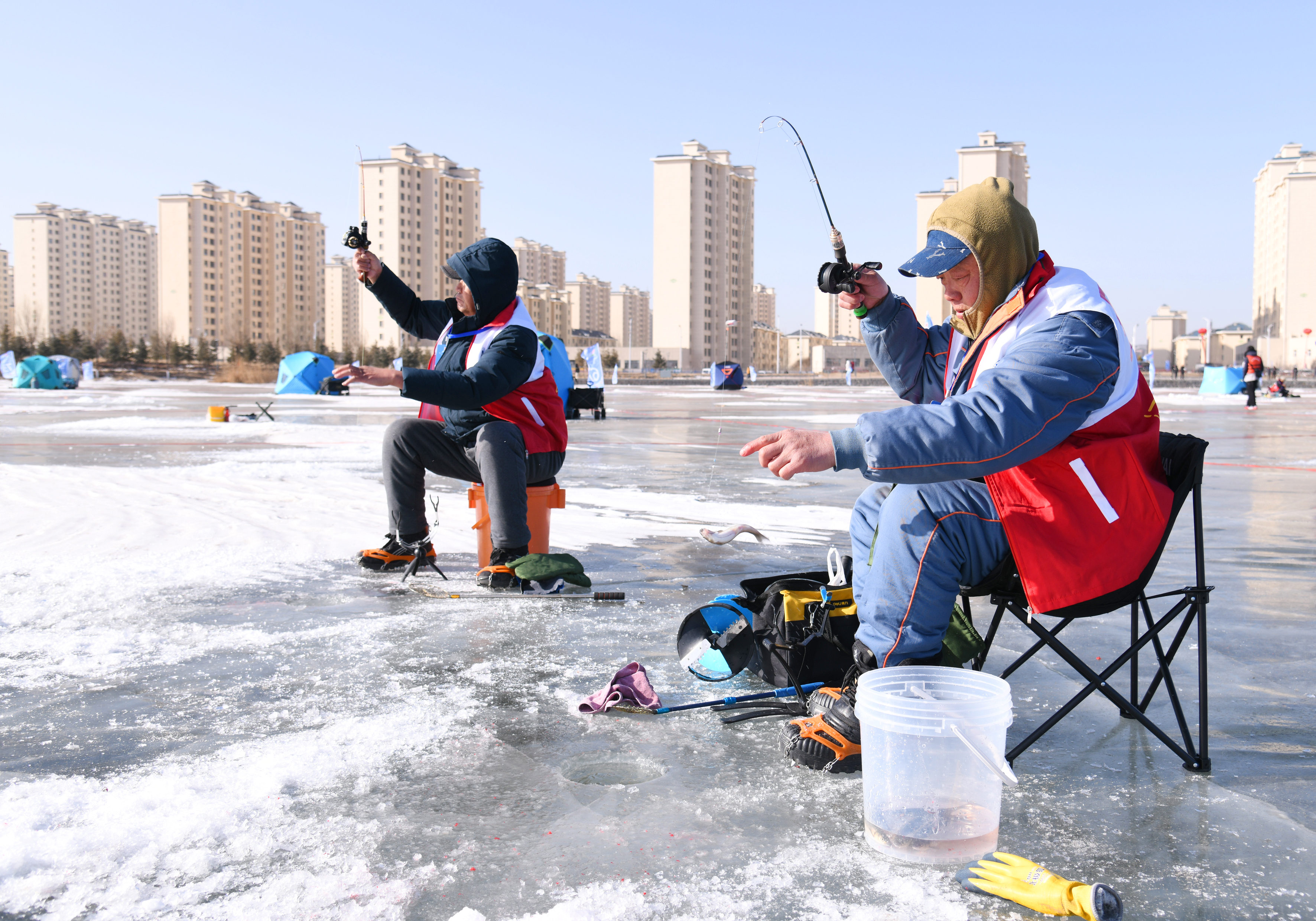 比賽現(xiàn)場,釣手們嚴(yán)格遵守比賽規(guī)則,團(tuán)結(jié)協(xié)作、頑強(qiáng)拼搏,從鑿冰破洞、搭設(shè)帳篷到操作漁具整個過程手法嫻熟,不僅賽出了風(fēng)格、賽出了水平,也展示了釣手們高超的垂釣技巧,為觀眾呈現(xiàn)了一場精彩紛呈的冰釣盛宴。