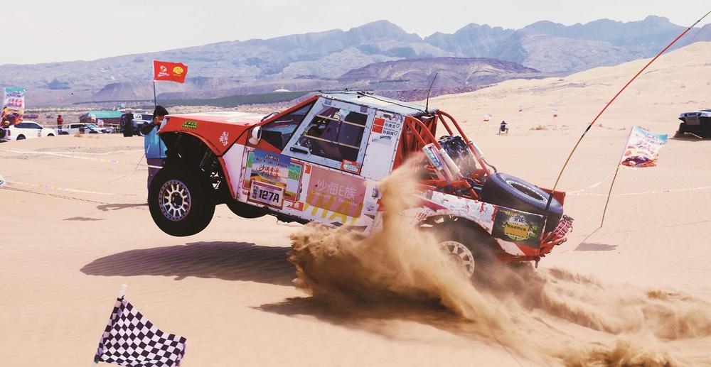來自各地的越野愛好者齊聚烏海,駕駛著越野車在沙漠中馳騁。 (趙政宇 攝)