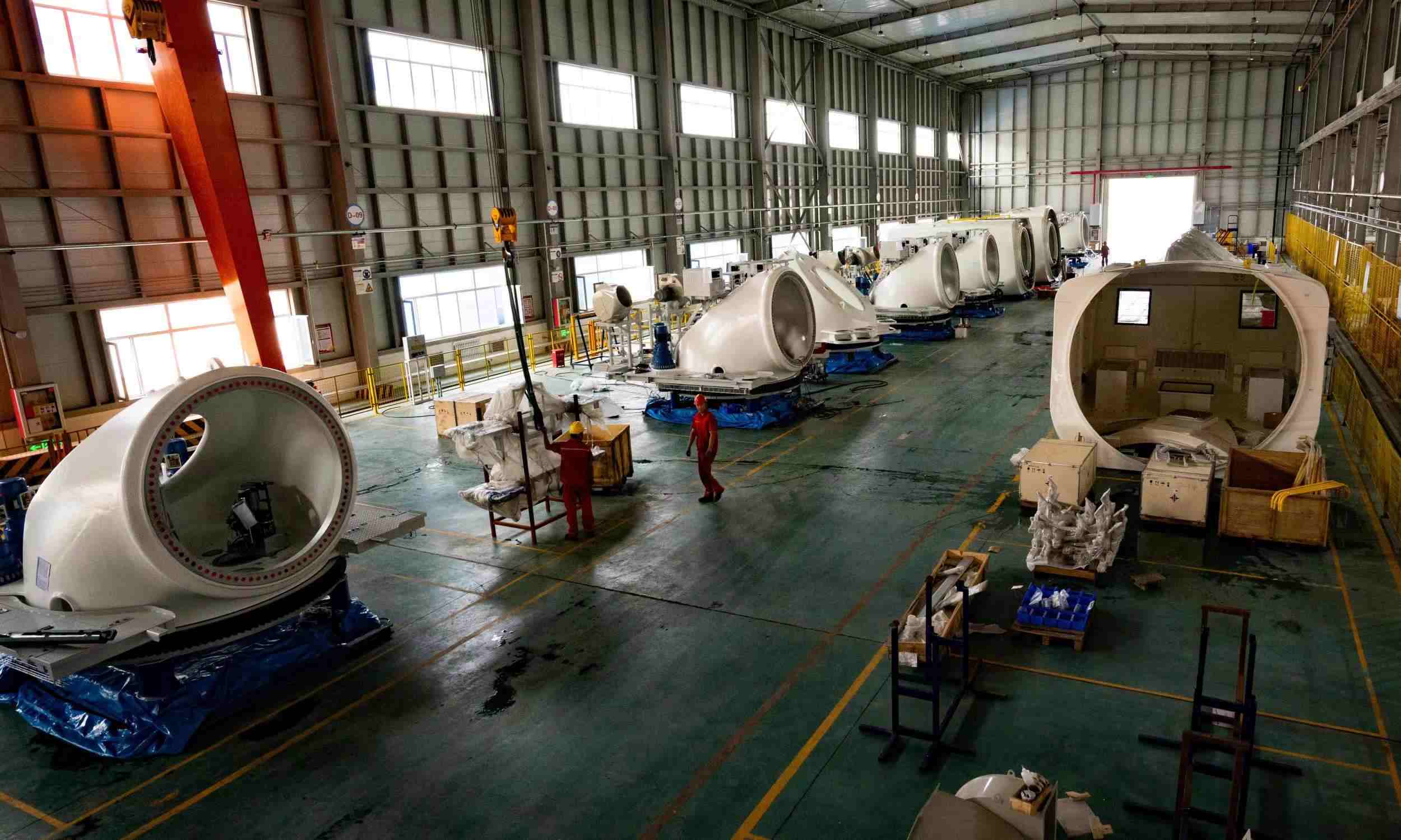 金風(fēng)科技公司工人在安裝風(fēng)機(jī)主機(jī)。金泉攝