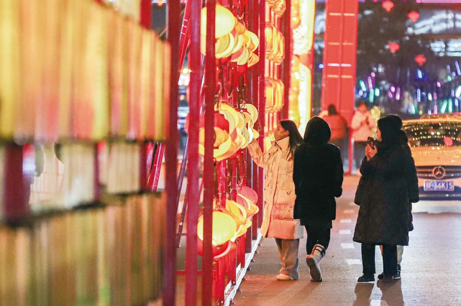 游客在烏蘭浩特前街步行街賞燈