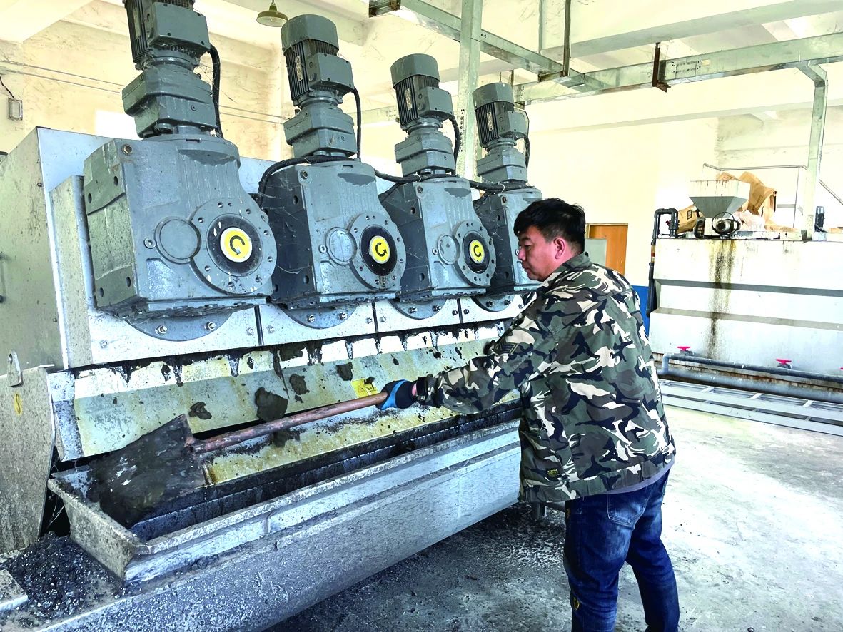 工人正在處理污水過(guò)濾后的污泥