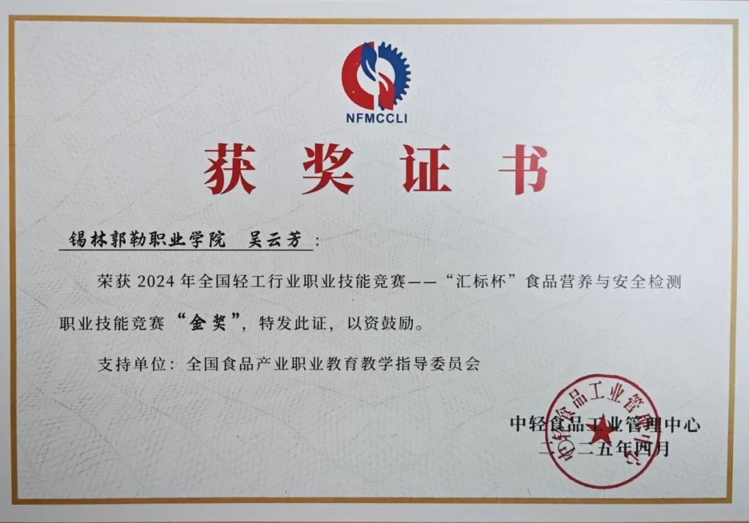 2025年4月21日,由中國(guó)輕工業(yè)聯(lián)合會(huì)、中輕食品工業(yè)管理中心、全國(guó)食品產(chǎn)業(yè)職業(yè)教育教學(xué)指導(dǎo)委員會(huì)等聯(lián)合舉辦的2024年全國(guó)輕工行業(yè)職業(yè)技能競(jìng)賽——“匯標(biāo)杯”食品營(yíng)養(yǎng)與安全檢測(cè)職業(yè)技能競(jìng)賽總決賽在廣州圓滿落幕。錫林郭勒職業(yè)學(xué)院食品檢測(cè)中心總工程師吳云芳同志榮獲金獎(jiǎng)?! ?/p>