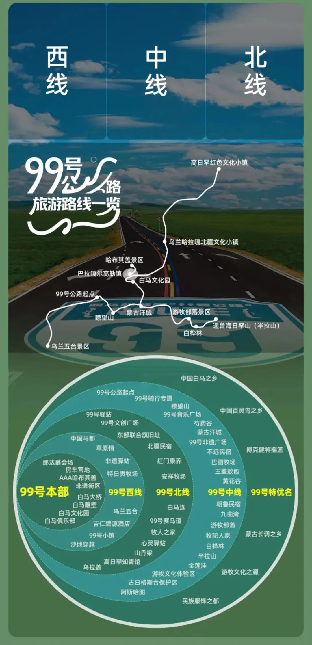 中線為G207舒圖査—瞭望山—蒙古汗城—半拉山,長87.6公里,是99號公路核心路段。其道路中線由紅黃藍三種顏色構成,成為公路獨特的標識。
