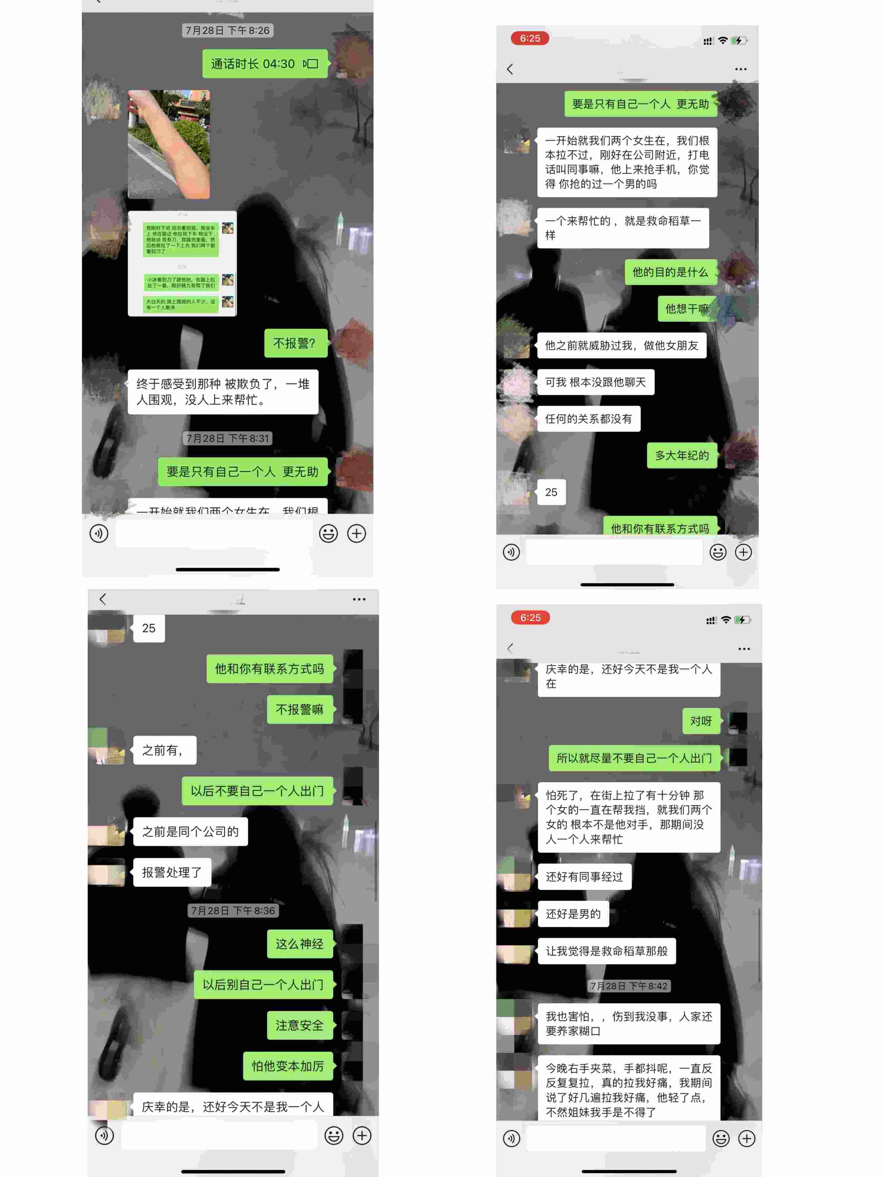 相關(guān)聊天截圖顯示,此次被黃某南威脅后,陳某萍和朋友在微信聊天時表示,“報(bào)警處理了”。陳某萍還表示,當(dāng)時,黃某南拉她上衣時,她看到了刀,感到非常害怕,幸好有同事出手相助?!八熬屯{過我,做他女朋友??晌腋緵]跟他聊天,任何關(guān)系都沒有。”