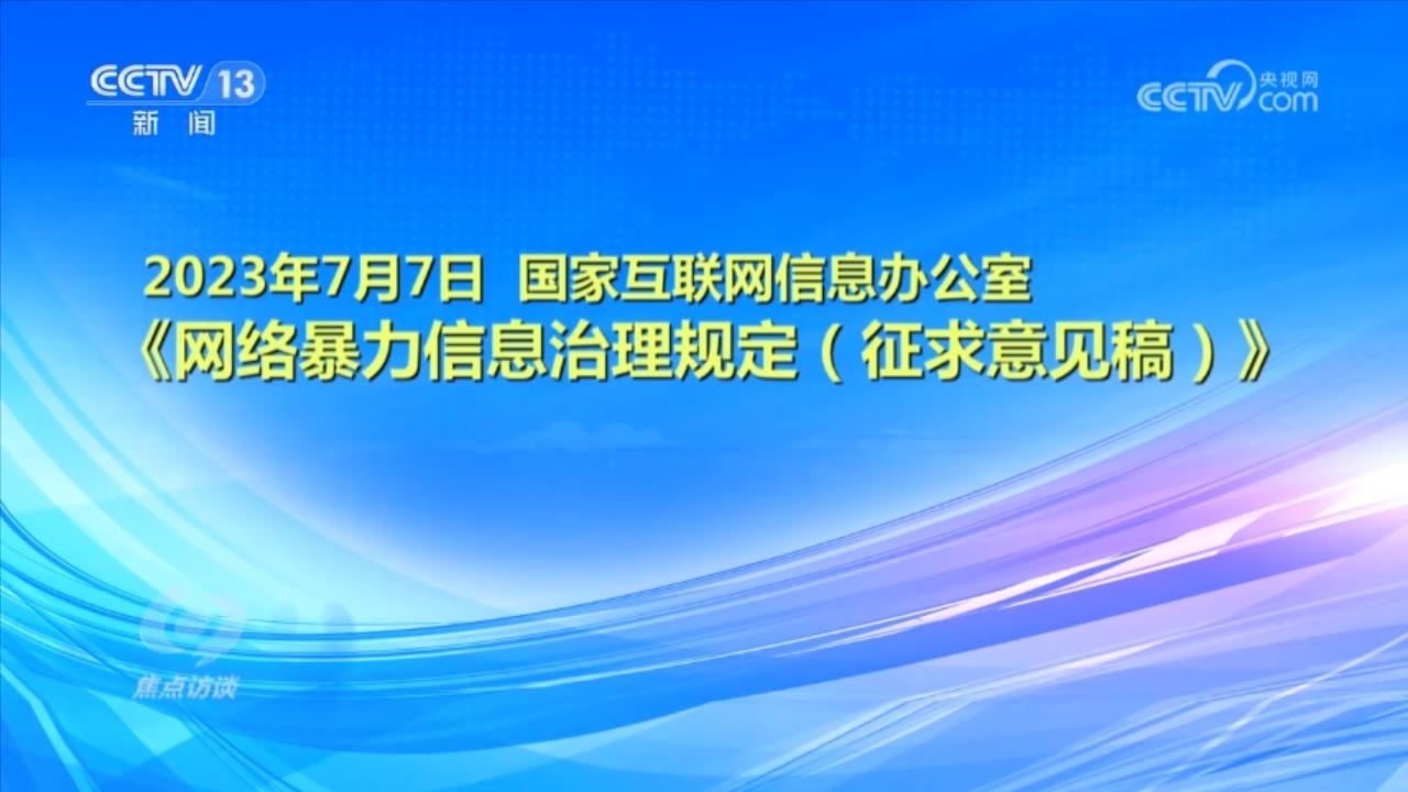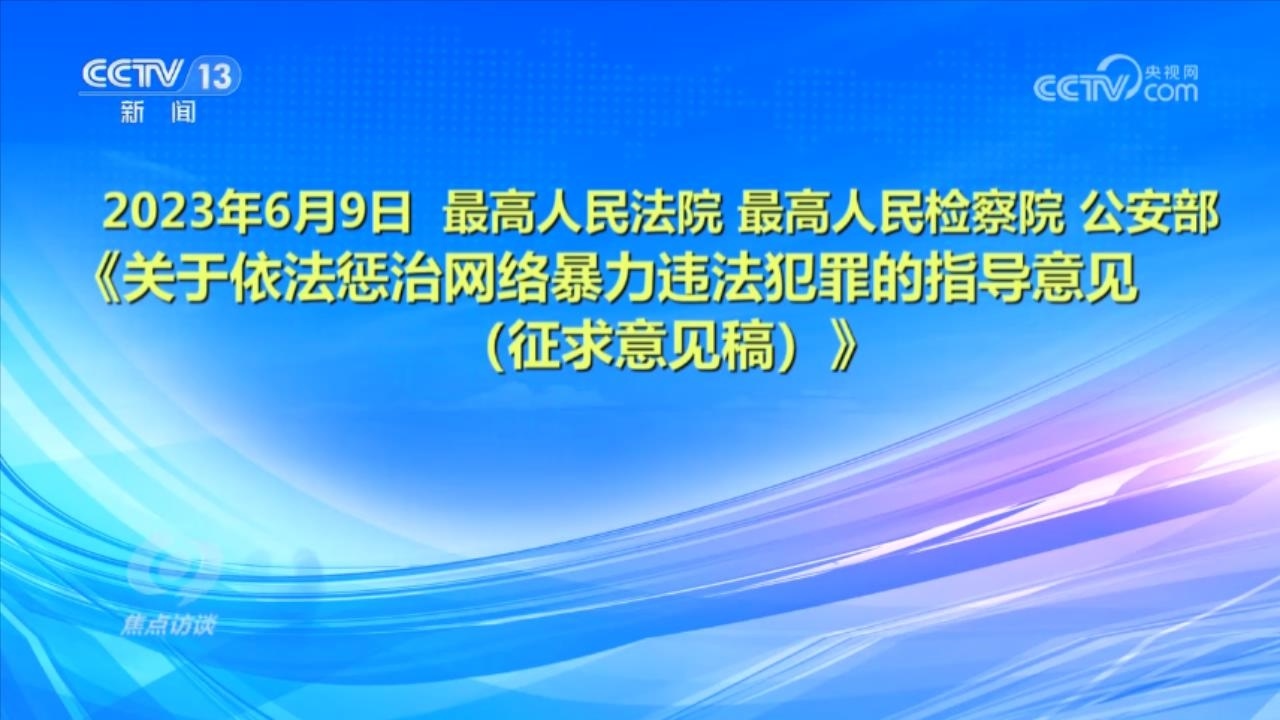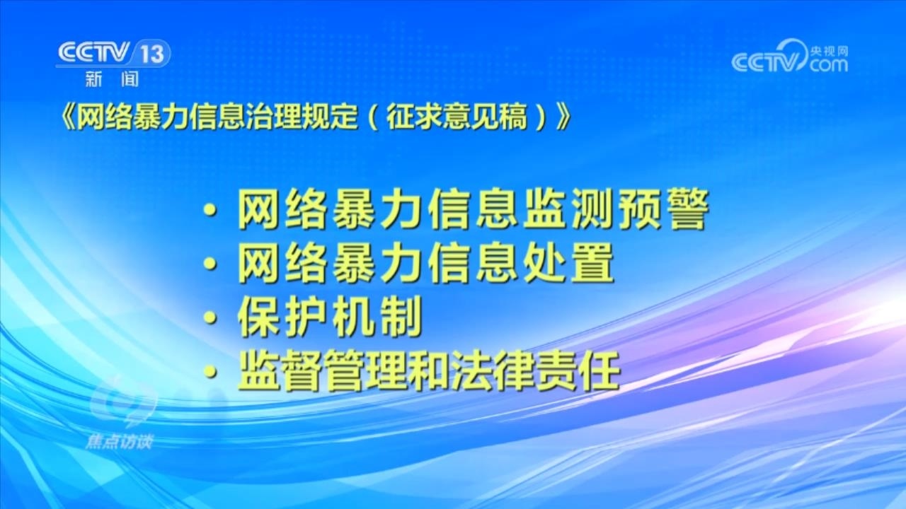 央視網(wǎng)消息(焦點訪談):俗話說“舌上有龍泉,殺人不見血”。網(wǎng)絡(luò)暴力不同于現(xiàn)實中的拳腳相加,但是這些在網(wǎng)絡(luò)空間中用文字、圖片等方式進行的傷害和侮辱,一樣可以對當(dāng)事人的現(xiàn)實生活產(chǎn)生惡劣的影響,讓當(dāng)事人的心靈“流血”。在傷害當(dāng)事人的同時,網(wǎng)絡(luò)暴力行為也嚴重污染了互聯(lián)網(wǎng)環(huán)境,影響社會和諧穩(wěn)定。近日,國家互聯(lián)網(wǎng)信息辦公室起草了《網(wǎng)絡(luò)暴力信息治理規(guī)定(征求意見稿)》,向社會公開征求意見;同樣是針對網(wǎng)絡(luò)暴力,在6月,最高人民法院、最高人民檢察院、公安部起草了《關(guān)于依法懲治網(wǎng)絡(luò)暴力違法犯罪的指導(dǎo)意見(征求意見稿)》,面向社會公開征求意見。治理網(wǎng)絡(luò)暴力這顆“毒瘤”,營造良好生態(tài)勢在必行。