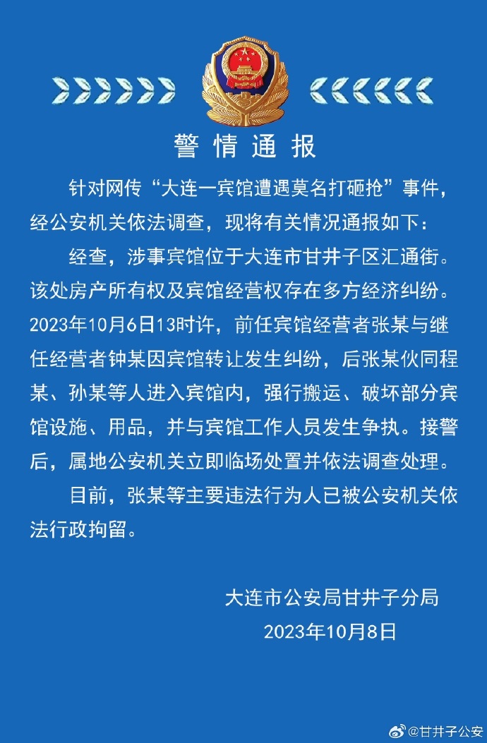 ·大連警方通報“賓館遭莫名打砸搶”:存多方經(jīng)濟糾紛,多人被拘。
