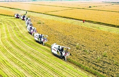 山東省德州市慶云縣鹽堿地上種植的千畝水稻收割現(xiàn)場。郭慶萍攝/光明圖片