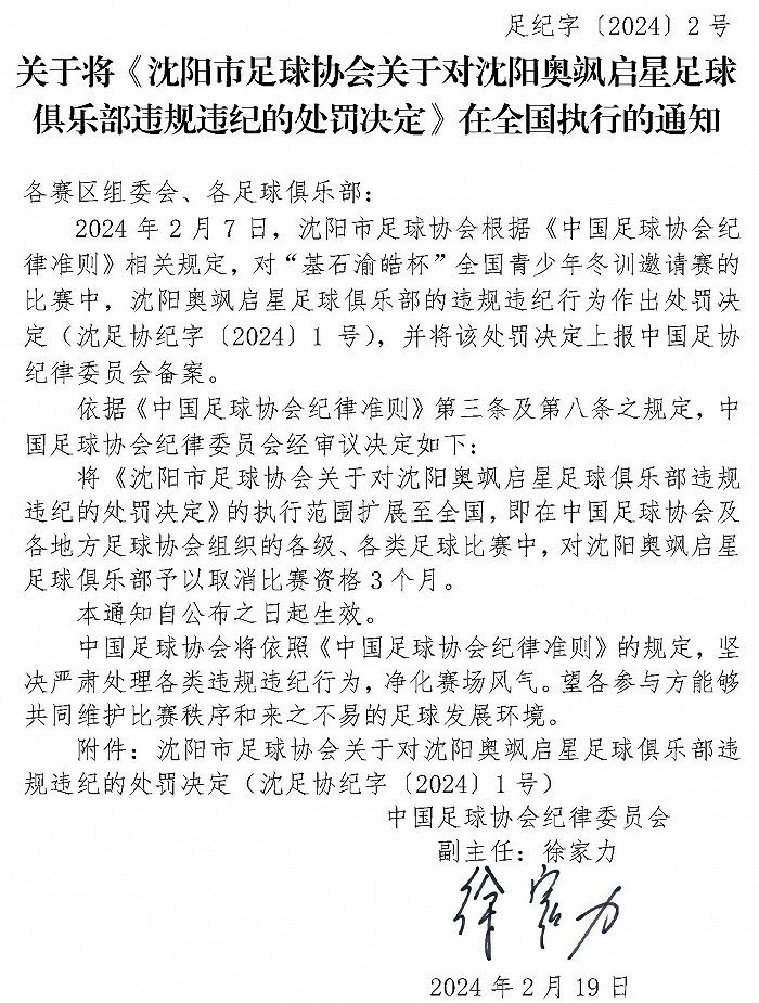 央視網(wǎng)消息:據(jù)中國足球協(xié)會(huì)2月21日發(fā)布通知,將《沈陽市足球協(xié)會(huì)關(guān)于對沈陽奧颯啟星足球俱樂部違規(guī)違紀(jì)的處罰決定》及《遼寧省足球運(yùn)動(dòng)協(xié)會(huì)關(guān)于對教練員吳高俊違規(guī)違紀(jì)的處罰決定》在全國執(zhí)行,具體內(nèi)容如圖:
