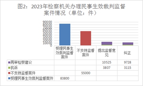 2023年,全國檢察機關(guān)始終堅持以習(xí)近平新時代中國特色社會主義思想特別是習(xí)近平法治思想為指導(dǎo),認(rèn)真貫徹落實《中共中央關(guān)于加強新時代檢察機關(guān)法律監(jiān)督工作的意見》,以“高質(zhì)效辦好每一個案件”作為履職辦案的基本價值追求,以專業(yè)化建設(shè)為基礎(chǔ),以提升辦案能力和水平為目標(biāo),認(rèn)真貫徹實施民法典,扎實推進(jìn)民事生效裁判監(jiān)督、審判活動監(jiān)督、執(zhí)行活動監(jiān)督、支持起訴、虛假訴訟監(jiān)督等各項工作,在完善案卷調(diào)閱制度、民事再審檢察建議制度、促進(jìn)社會治理等方面取得新進(jìn)展新成效。