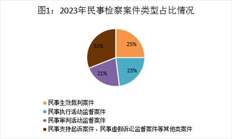 2023年,全國檢察機關(guān)民事檢察監(jiān)督規(guī)模進(jìn)一步擴大,全流程監(jiān)督格局逐步完善,總體發(fā)展保持均衡態(tài)勢。全年共受理各類民事檢察案件33.29萬件,案件數(shù)量持續(xù)上升。其中,民事生效裁判案件占受理總數(shù)的25%,民事執(zhí)行活動監(jiān)督案件占23%,民事審判活動監(jiān)督案件占21%,民事支持起訴案件、民事虛假訴訟監(jiān)督案件等其他類案件占31%。