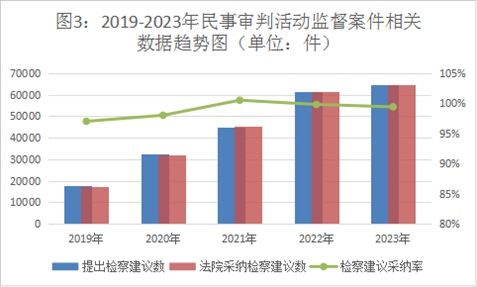 2023年,全國檢察機關(guān)共受理民事審判活動監(jiān)督案件6.94萬件,同期審結(jié)6.96萬件(含積存)。提出檢察建議6.47萬件,同比上升5.1%,占審結(jié)案件數(shù)的93%,同比增加4.2個百分點。對提出的檢察建議,法院同期采納6.46萬件,檢察建議采納率達(dá)99%。一些地區(qū)通過開展專項監(jiān)督,加強辦案力度,提高辦案效果,推動民事審判活動監(jiān)督向深層次違法監(jiān)督轉(zhuǎn)變。
