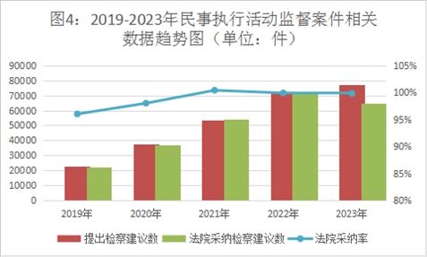 民事執(zhí)行活動監(jiān)督辦案效率高,檢察建議采納率保持高位。2023年,全國檢察機關(guān)共受理民事執(zhí)行活動監(jiān)督案件7.73萬件,審結(jié)7.72萬件。提出檢察建議6.49萬件,占審結(jié)案件的84%,同比持平。對提出的檢察建議,被監(jiān)督單位同期采納6.48萬件,民事執(zhí)行監(jiān)督檢察建議采納率達(dá)99%。