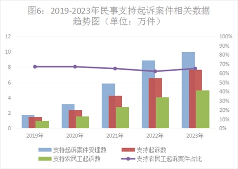 一是民事支持起訴數(shù)量上升較快。2023年,全國檢察機關(guān)共受理民事支持起訴案件10.14萬件,同比上升13.9%,審查后支持起訴7.73萬件,其中支持農(nóng)民工起訴5.08萬件。從案件類型上看,主要以勞動爭議(占43.9%)、合同糾紛(占33%)、婚姻家庭糾紛(占6.7%)為主。
