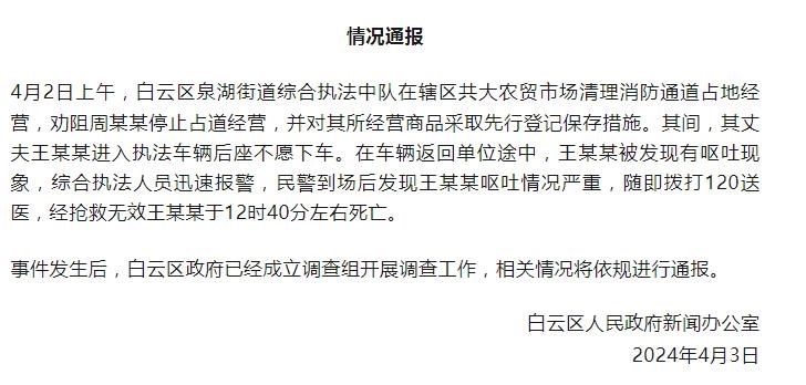 央視網消息:據貴陽網官微消息,4月3日,貴陽市白云區(qū)人民政府新聞辦公室通報,4月2日上午,白云區(qū)泉湖街道綜合執(zhí)法中隊在轄區(qū)共大農貿市場清理消防通道占地經營,勸阻周某某停止占道經營,并對其所經營商品采取先行登記保存措施。其間,其丈夫王某某進入執(zhí)法車輛后座不愿下車。在車輛返回單位途中,王某某被發(fā)現有嘔吐現象,綜合執(zhí)法人員迅速報警,民警到場后發(fā)現王某某嘔吐情況嚴重,隨即撥打120送醫(yī),經搶救無效王某某于12時40分左右死亡。