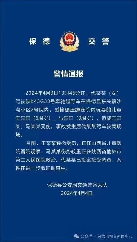 央視網(wǎng)消息:據(jù)保德縣融媒體中心消息,4月4日,保德縣公安局交通警察大隊發(fā)布警情通報:2024年4月3日13時45分許,代某某(女)駕駛陜K43G33號奔馳越野車在保德縣東關(guān)鎮(zhèn)沙溝小區(qū)2號院內(nèi),碰撞碾壓蹲在院內(nèi)玩耍的兒童王某某(6周歲)、馬某某(9周歲),造成王某某、馬某某受傷。事故發(fā)生后代某某駕車駛離現(xiàn)場。