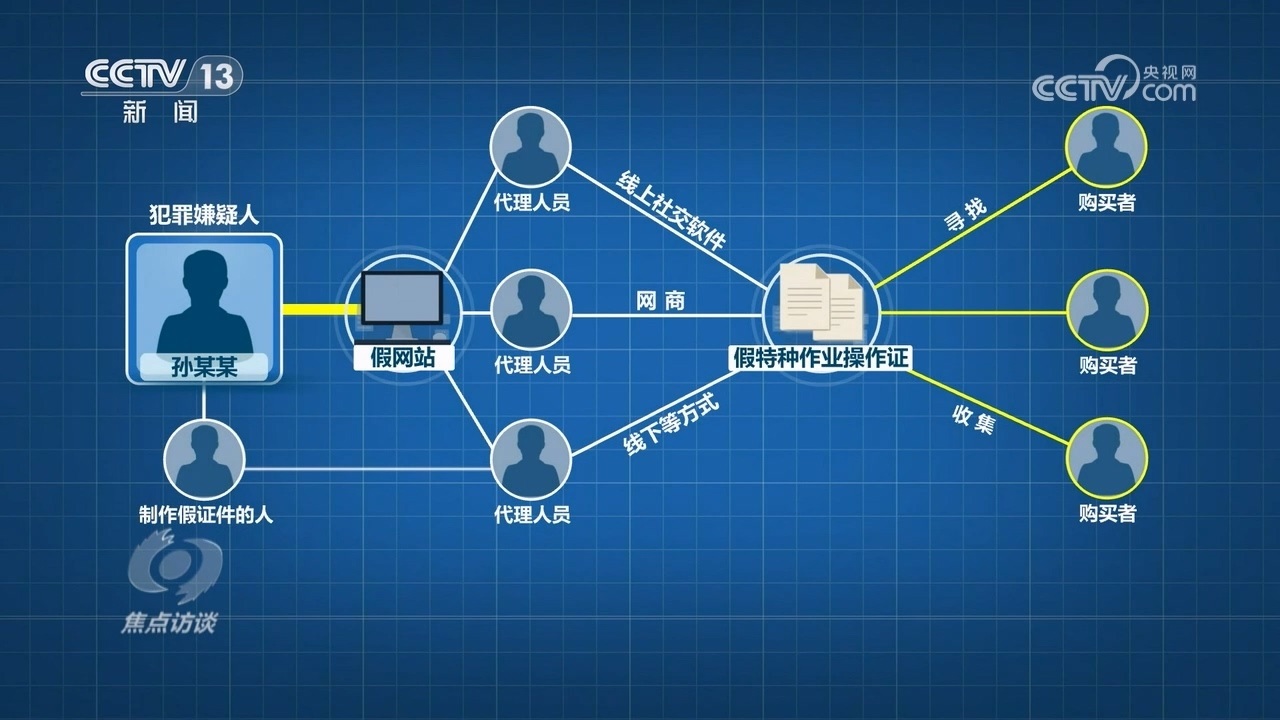 據(jù)介紹,犯罪嫌疑人孫某某是最上游,他首先花錢雇人制作了假網(wǎng)站,然后發(fā)展多名代理人員,代理通過線上社交軟件、網(wǎng)商和線下等方式,尋找、收集花錢購買假的特種作業(yè)操作證的人員。由專門負責制作假證件的人,制作好假證,發(fā)送給相應(yīng)的下線代理人員,最后到購買者手里。