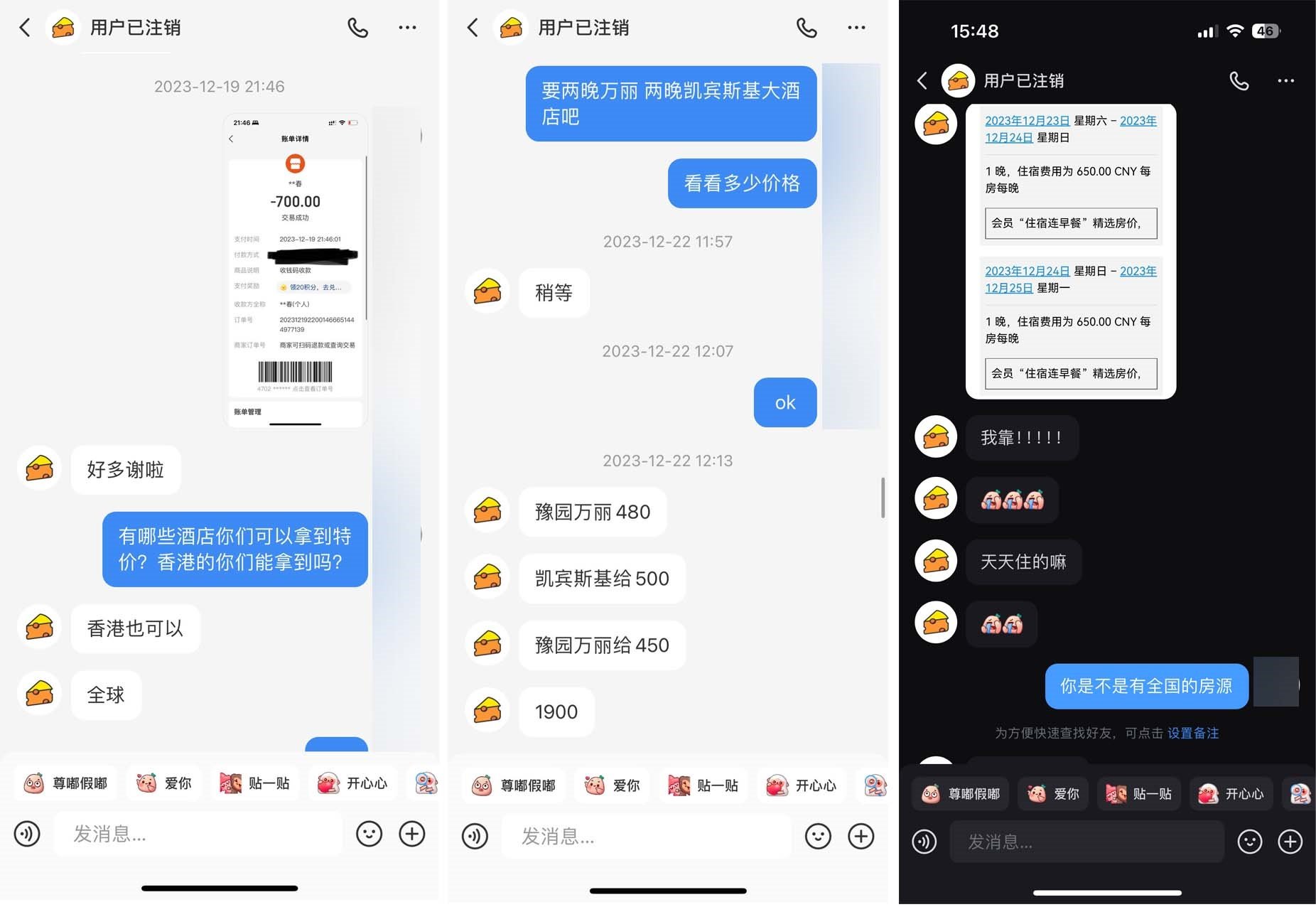 對方了解吳女士訴求后,很快提供了上海多家高檔酒店的折扣信息。吳女士表示,這名博主的報(bào)價(jià)可以做到“五折”,大幅低于市面上的訂房價(jià)格,令其不安。但對方則承諾這些“折扣房”系內(nèi)部價(jià)格,有“員工房”“協(xié)議房”或“積分房”等,訂房信息保真,須預(yù)付房費(fèi)且不能通過平臺直接交易。