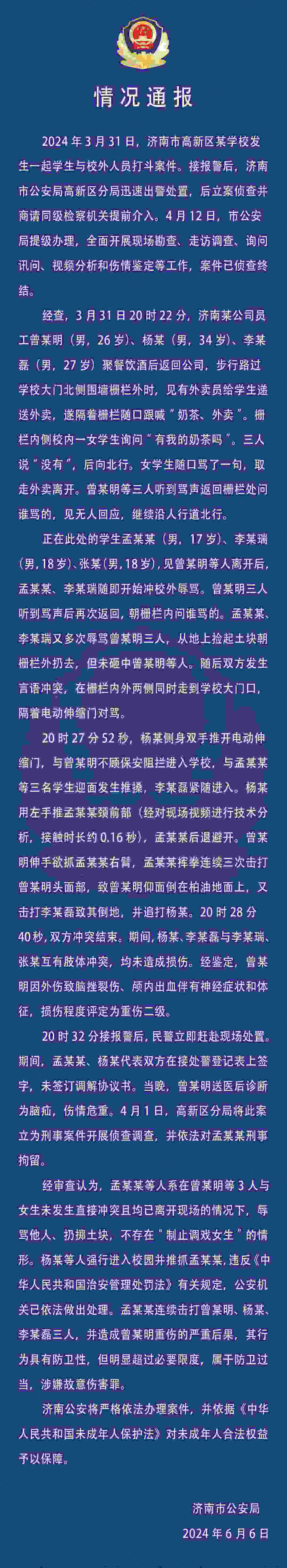 學(xué)生與醉漢沖突、被拘留 濟南警方:涉事學(xué)生屬于防衛(wèi)過當(dāng)