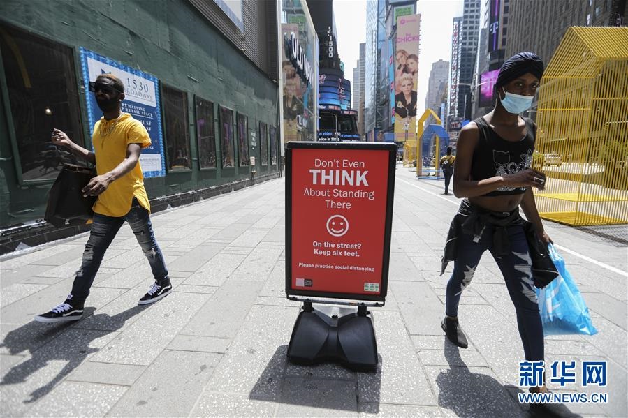 7月23日,在美國(guó)紐約時(shí)報(bào)廣場(chǎng),人們從保持社交距離的提示牌旁走過(guò)。美國(guó)約翰斯·霍普金斯大學(xué)23日發(fā)布的新冠疫情最新統(tǒng)計(jì)數(shù)據(jù)顯示,美國(guó)累計(jì)確診病例超過(guò)400萬(wàn)例。數(shù)據(jù)顯示,截至美國(guó)東部時(shí)間23日15時(shí)34分(北京時(shí)間24日3時(shí)34分),美國(guó)累計(jì)確診病例4007859例,累計(jì)死亡病例143846例。新華社記者王迎攝