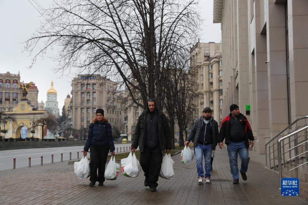 2月24日,在烏克蘭基輔,當(dāng)?shù)鼐用窳嘀少?gòu)的物資走在街道上。新華社記者 李東旭 攝