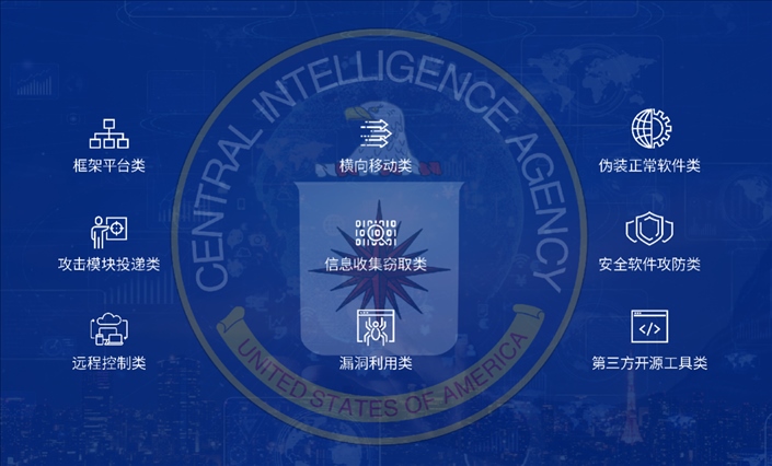 國(guó)家病毒應(yīng)急處理中心和360公司通過(guò)進(jìn)一步技術(shù)分析發(fā)現(xiàn),盡管CIA的后門(mén)程序和攻擊組件大都以無(wú)實(shí)體文件的內(nèi)存駐留執(zhí)行的方式運(yùn)行,這使得對(duì)相關(guān)樣本的發(fā)現(xiàn)和取證難度極大。即使這樣,聯(lián)合技術(shù)團(tuán)隊(duì)還是成功找到了解決取證難題的有效方法,發(fā)現(xiàn)了CIA所使用的9個(gè)類(lèi)別的攻擊武器,包括攻擊模塊投遞類(lèi)、遠(yuǎn)程控制類(lèi)、信息收集竊取類(lèi)、第三方開(kāi)源工具類(lèi)等。