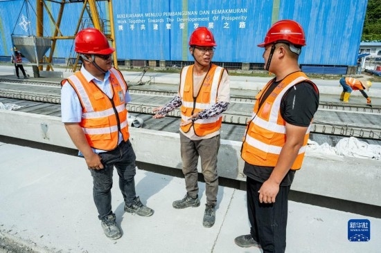 4月26日,在馬來西亞吉蘭丹州的馬東鐵項(xiàng)目一分部制梁場,技術(shù)主管鄧友志(右)和馬來西亞本地青年員工鄧德緯討論生產(chǎn)情況。五月初的馬來西亞烈日炎炎,中馬共建“一帶一路”的標(biāo)志性項(xiàng)目——馬來西亞東海岸鐵路(馬東鐵)建設(shè)如火如荼。十支由中馬兩國員工組成的青年突擊隊(duì)活躍在全長600多公里的馬東鐵沿線建設(shè)現(xiàn)場,用汗水和擔(dān)當(dāng)抒寫屬于這個(gè)時(shí)代的青春篇章。新華社記者 朱煒 攝