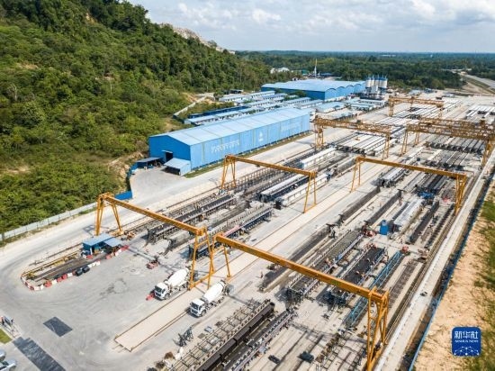這是4月26日在馬來西亞吉蘭丹州拍攝的馬東鐵項(xiàng)目一分部制梁場(無人機(jī)拍攝)。新華社記者 朱煒 攝