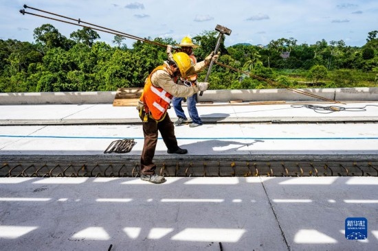 4月26日,工人在馬來西亞吉蘭丹州的馬東鐵項(xiàng)目一分部5號(hào)橋建設(shè)現(xiàn)場工作。新華社記者 朱煒 攝