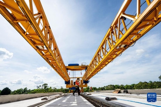 4月26日,工人在馬來西亞吉蘭丹州的馬東鐵項(xiàng)目一分部制梁場工作。新華社記者 朱煒 攝