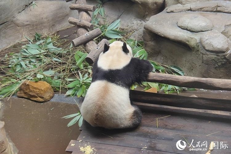 記者趕到時(shí),離開(kāi)爸爸媽媽單獨(dú)生活的“圓夢(mèng)”正躺在木床上呼呼大睡,四仰八叉的可愛(ài)模樣吸引游客們紛紛駐足,拍照留念。動(dòng)物園工作人員介紹說(shuō),“圓夢(mèng)”現(xiàn)在已經(jīng)五歲多了,體重超過(guò)100公斤,身高也同成年大熊貓無(wú)差,活潑好動(dòng)、元?dú)鉂M滿。隨著飼養(yǎng)員往園內(nèi)投入新鮮的竹子,“圓夢(mèng)”也慢慢醒過(guò)來(lái),開(kāi)始享用竹子大餐?!拔铱梢砸徽煸谶@里看它吃飯!真的太可愛(ài)了!這是我在動(dòng)物園最喜歡的動(dòng)物!”今年8歲的梅麗莎興奮地說(shuō)。