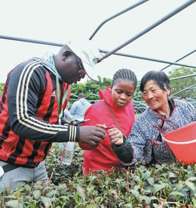 4月21日,在山東泰安道朗鎮(zhèn),非洲青年代表向茶農學習采摘知識。本報記者 陳尚文攝