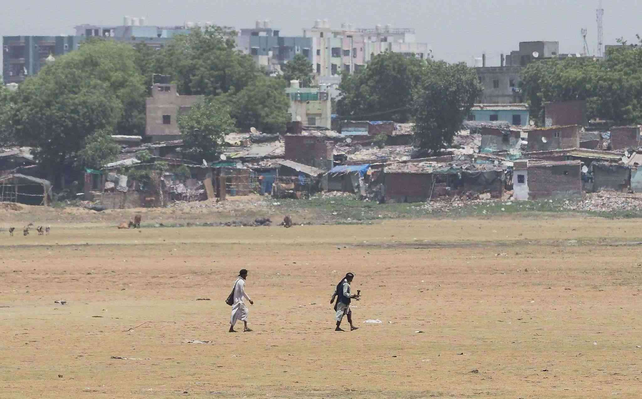 當(dāng)?shù)貢r(shí)間2023年5月10日,印度艾哈邁達(dá)巴德,人們走在干涸的河床上。
