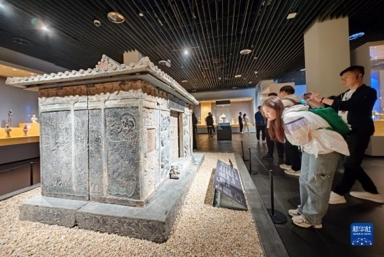 5月8日,游客在西安博物院參觀(guān)史君墓石槨。墓主史君是北周涼州薩保,粟特人。石槨整體為中國(guó)傳統(tǒng)歇山頂?shù)钐檬浇ㄖ?,四壁浮雕?nèi)容和風(fēng)格則帶有鮮明的西域特色。
