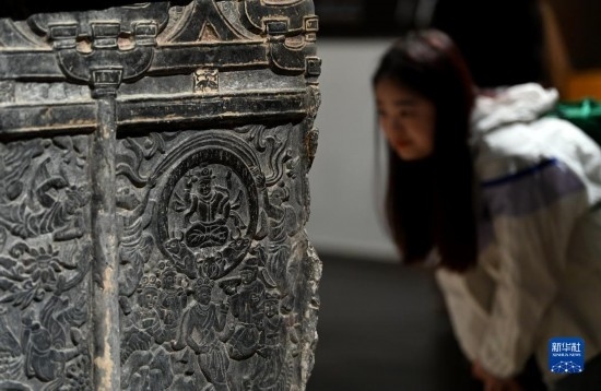 這是在西安博物院展出的史君墓石槨,槨門(mén)門(mén)楣上用漢文和粟特文刻著墓主墓志(5月8日攝)。墓主史君是北周涼州薩保,粟特人。石槨整體為中國(guó)傳統(tǒng)歇山頂?shù)钐檬浇ㄖ?,四壁浮雕?nèi)容和風(fēng)格則帶有鮮明的西域特色。