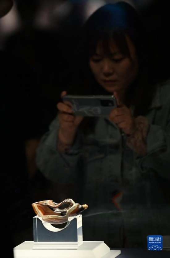 5月11日,游客在陜西歷史博物館參觀(guān)鑲金獸首瑪瑙杯。鑲金獸首瑪瑙杯的造型,與起源于古希臘的酒具“來(lái)通”相似,“來(lái)通”曾廣泛流行于中亞、西亞地區(qū),沿著絲綢之路不斷東傳進(jìn)入中國(guó)。