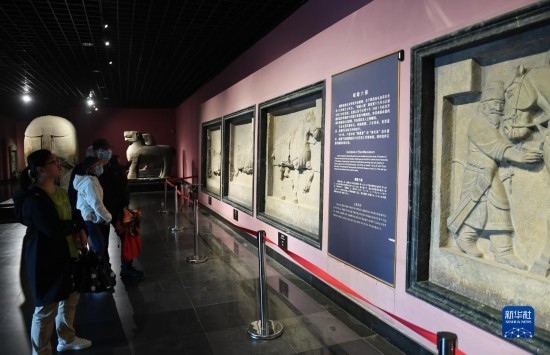 5月9日,游客在西安碑林博物館內(nèi)參觀(guān)昭陵六駿石雕。唐昭陵六駿石刻是為紀(jì)念六匹隨唐太宗李世民征戰(zhàn)疆場(chǎng)的戰(zhàn)馬而刻制的,其中特勤驃等馬匹帶有明顯的西域良馬特征。
