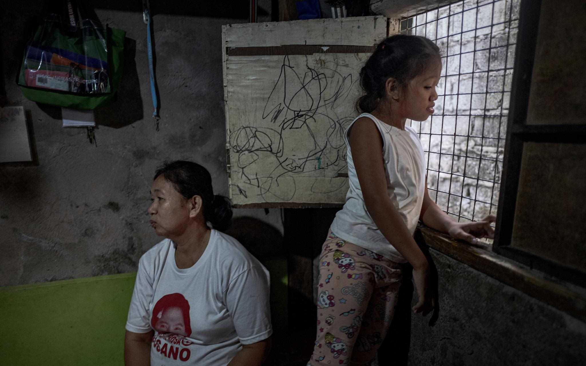 當(dāng)?shù)貢r(shí)間2023年4月15日,菲律賓馬尼拉,奎松市,Corazon Mercado(左)和她的女兒Bea坐在家里。據(jù)Corazon Mercado說(shuō):“我們買(mǎi)不起大瓶或散裝的必需品,我們只能買(mǎi)得起小袋的日常必需品?!?/p>