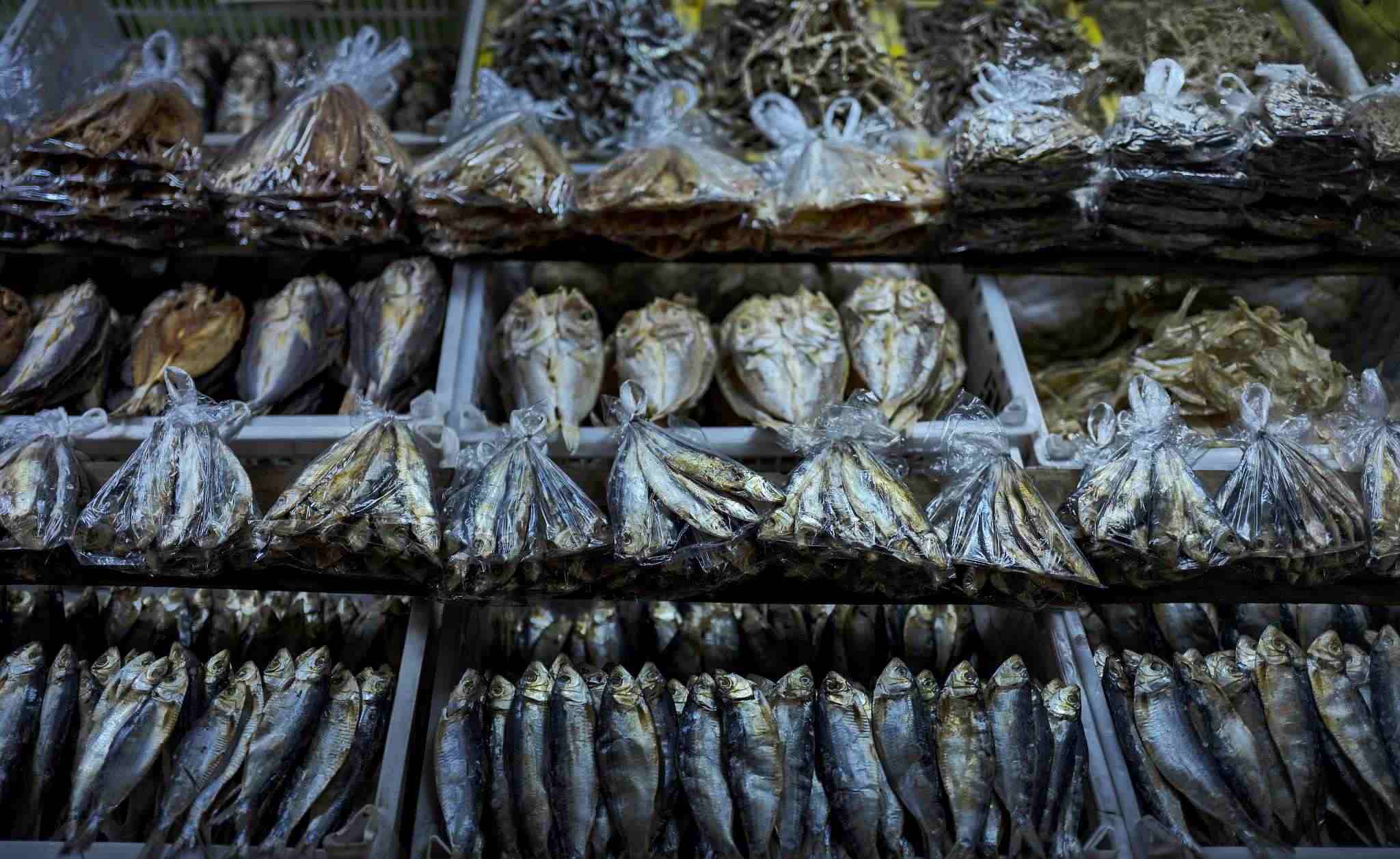 當(dāng)?shù)貢r(shí)間2023年4月19日,菲律賓馬尼拉菜市場(chǎng)上,用塑料袋包裹著的魚(yú)干。