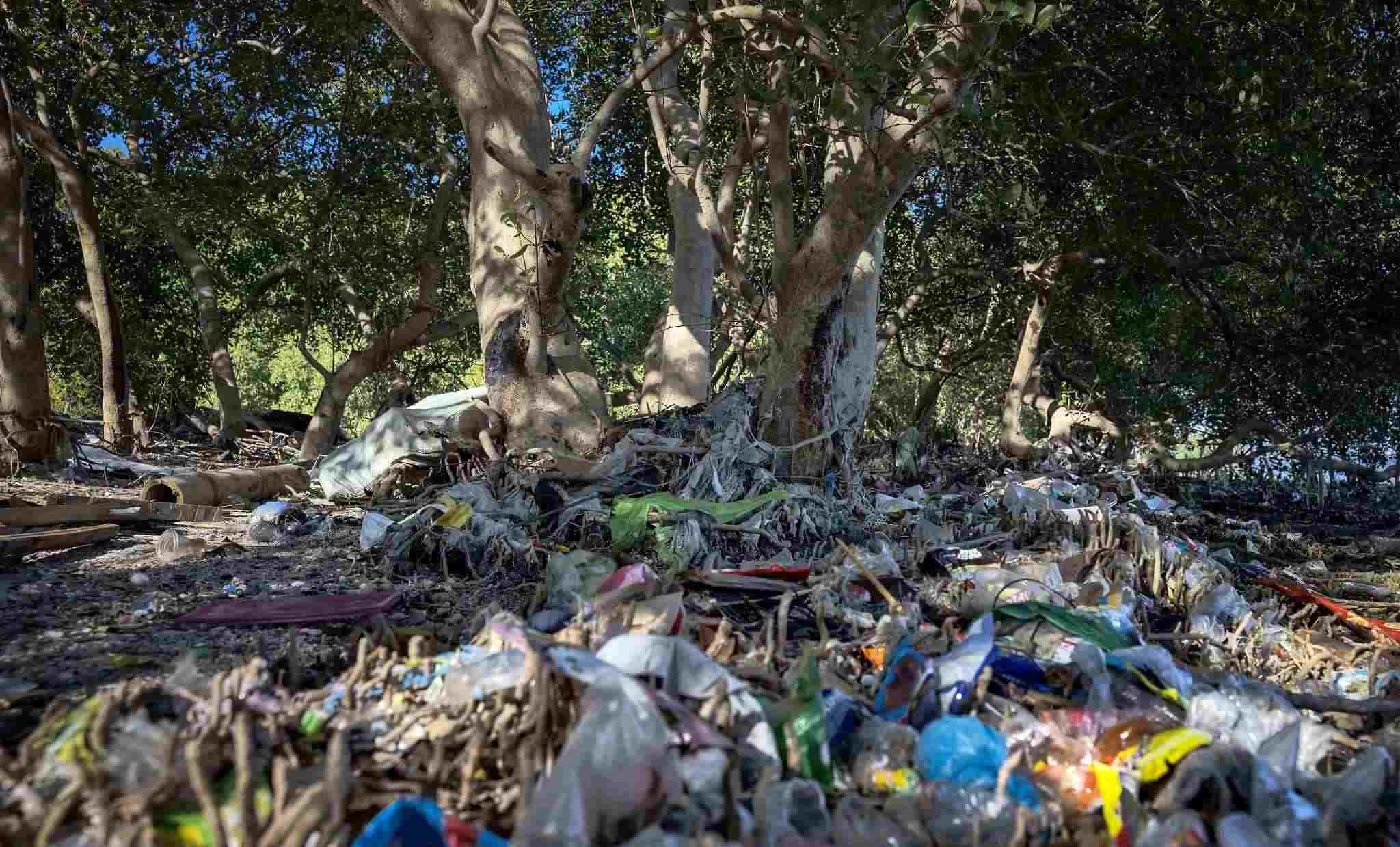 當(dāng)?shù)貢r(shí)間2023年4月19日,菲律賓馬尼拉,帕拉納克,自由島紅樹(shù)林上的塑料垃圾。