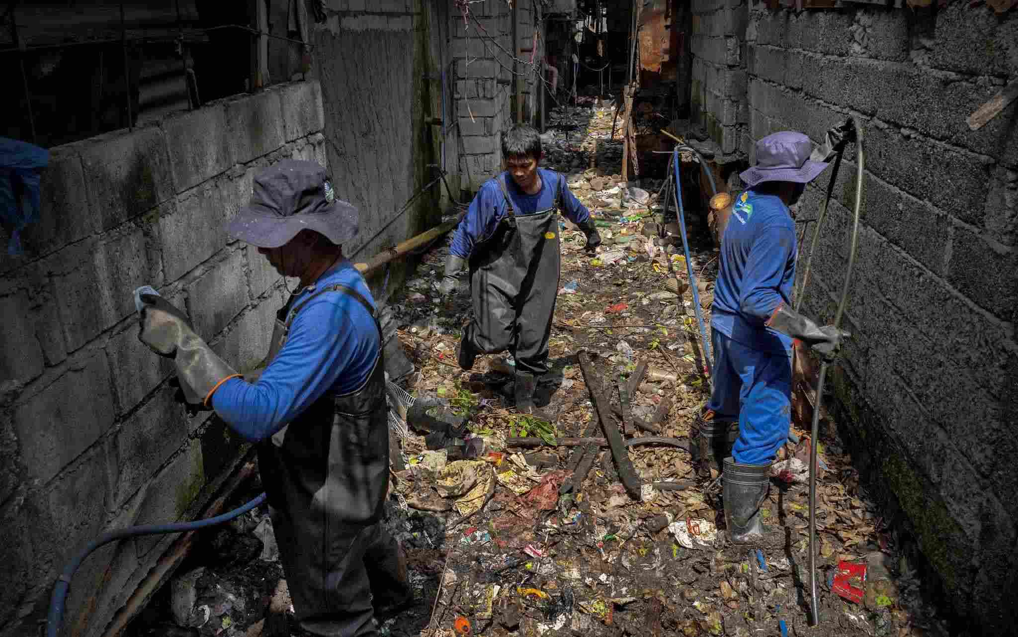 當(dāng)?shù)貢r(shí)間2023年4月15日,菲律賓馬尼拉,工人們清理一條被塑料垃圾堵塞的小溪。