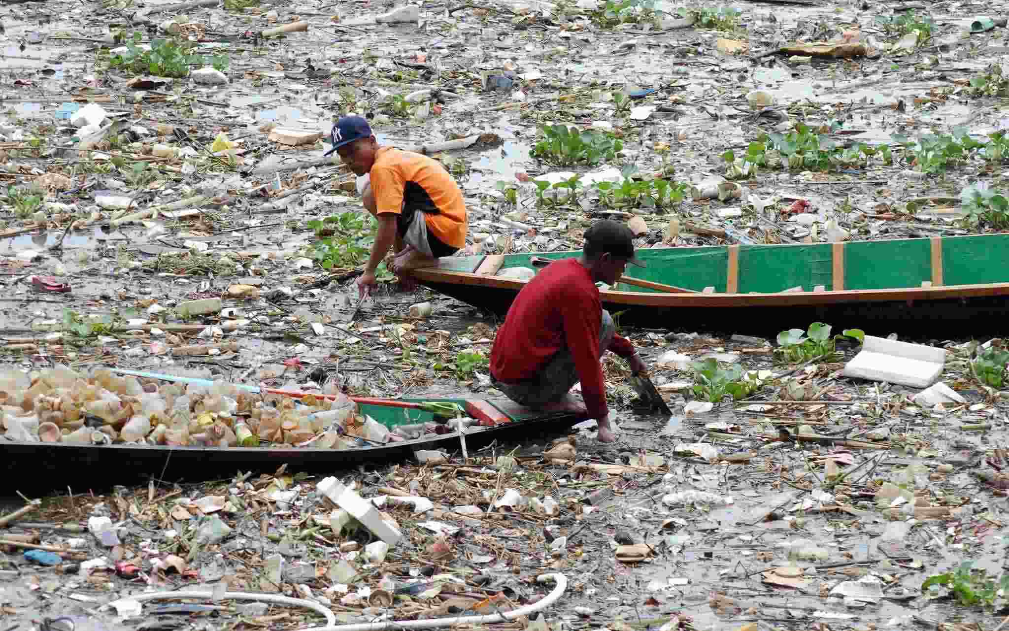 當(dāng)?shù)貢r(shí)間2023年3月28日,印度尼西亞萬(wàn)隆,兩名工人在芝塔龍河道中收集塑料。