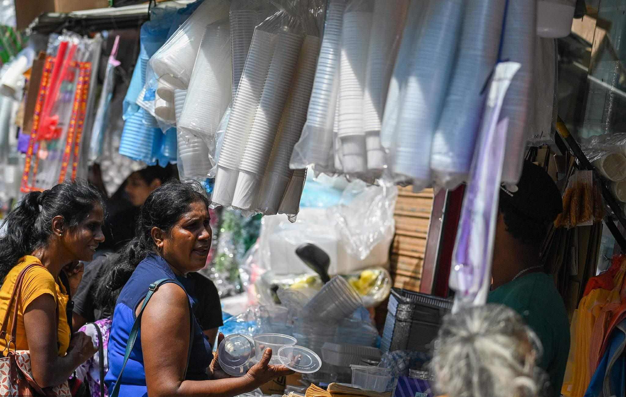 當(dāng)?shù)貢r(shí)間2023年2月14日,斯里蘭卡科倫坡市場(chǎng)的一家商店里,顧客在購(gòu)買(mǎi)塑料餐具。