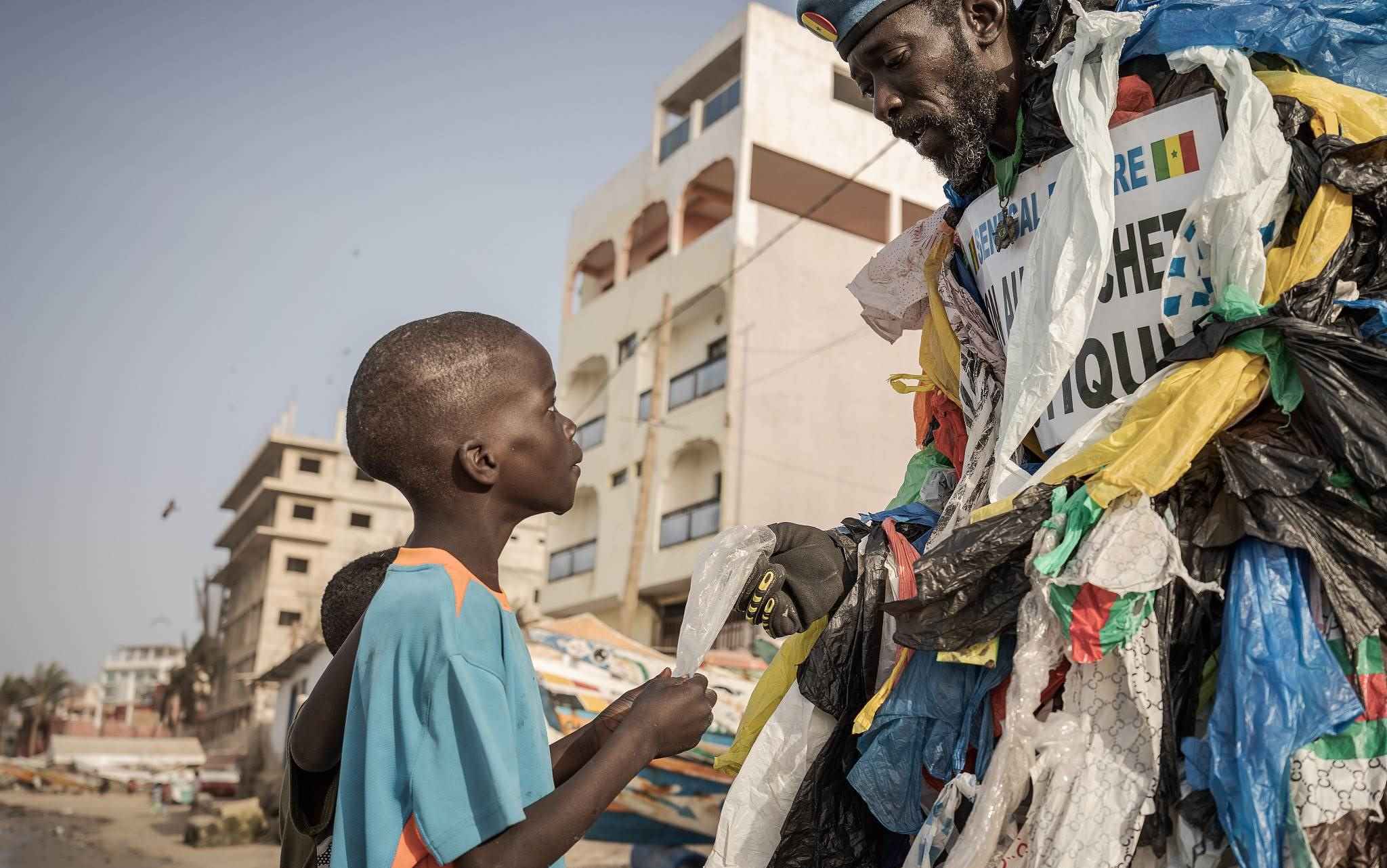 當(dāng)?shù)貢r(shí)間2023年4月5日,塞內(nèi)加爾達(dá)喀爾,49歲的塞內(nèi)加爾環(huán)保活動(dòng)家莫杜·法爾,被稱(chēng)為“塑料人”,和一個(gè)孩子在海灘上散步時(shí)拿著一個(gè)塑料包裝,提醒人們注意使用一次性塑料的污染。