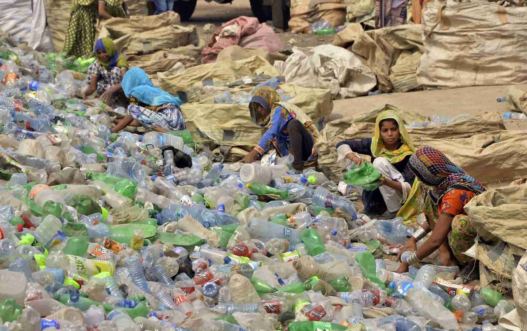 當(dāng)?shù)貢r(shí)間2023年4月30日,巴基斯坦海得拉巴,婦女們?cè)谝患宜芰匣厥展S里整理空瓶子。